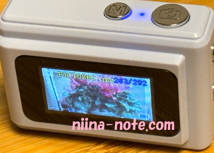液晶画面はドット感が強くオマケ程度ではありますが、こんなに小さなカメラで動画の再生まで出来る(音声も出ます!)のは凄いと思いました。