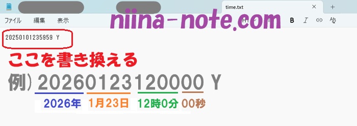 例えば「2026年1月23日12時00分00秒」にしたい場合、「20260123120000 Y」に書き換えて上書き保存しましょう。